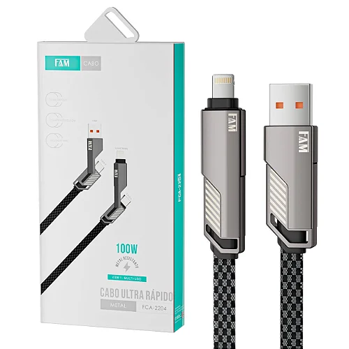 Cabo metálico de alta resistência para carregamento e transmissão de dados, Multiuso, 2 em 1, USB / USB-C / Lightning, Marca FAM, Modelo FCA-2203.