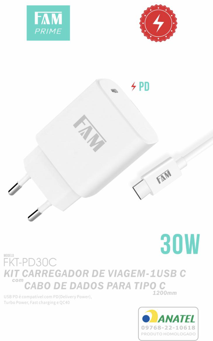 KIT CARREGADOR + CABO TIPO C/TIPO C 1 USB 30W FKT-PD30C FAM